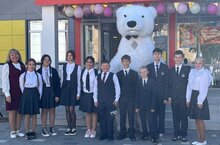 В честь 25-летия открытия гимназии в гости пришёл белый Мишка и поздравил всех присутствующих с этой знаменательной датой)