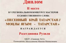 Поздравляем Разетдинову Рузилю, ученицу 9г класса и ее руководителя Масаллимову Мавлию Минвалиевну с получением 2 места в Региональном конкурсе мастеров художественного слова "Песенный край Татарстан"!
