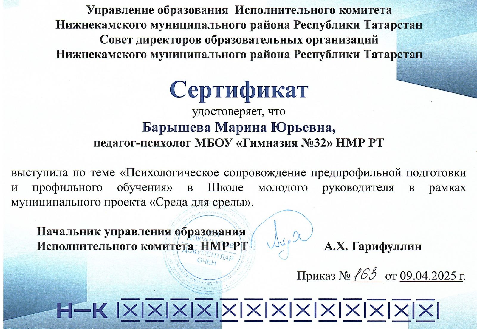 | Короткое название: | МБОУ "Гимназия №32" НМР РТ |