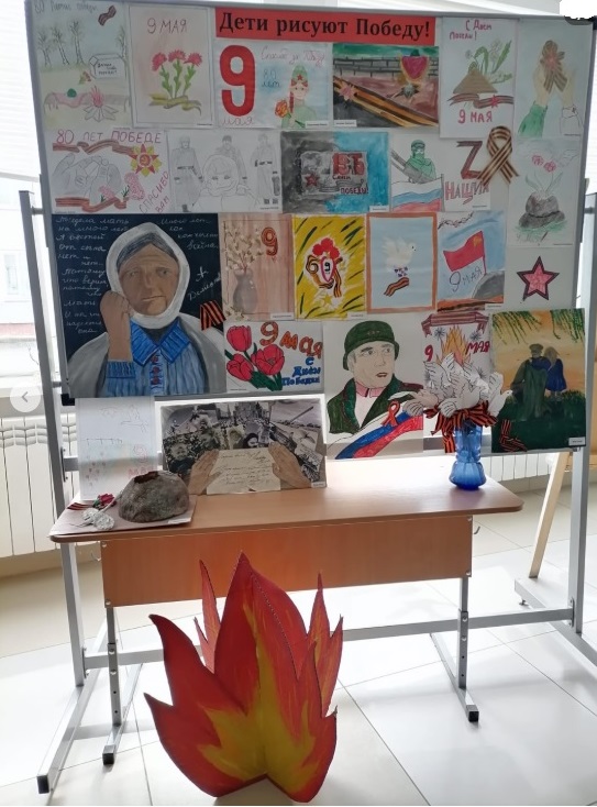 Сегодня, 2 мая, в фойе школы была оформлена выставка детских рисунков и поделок "Дети рисуют Победу!"