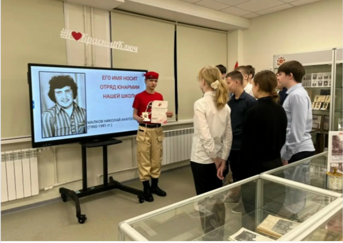В одной известной песне советских времён поётся: "Нет в России семьи такой, где б не памятен был свой герой...". Такой герой есть и в нашей школьной семье - это воин-интернационалист Малков Николай. Григорьева С. Р. в 9 классах провела музейный урок «Его имя носит отряд ЮНАРМИИ»,на котором ребята ещё раз вспомнили жизнь и подвиг Николая, поговорили о том, что значит служить Отечеству. -