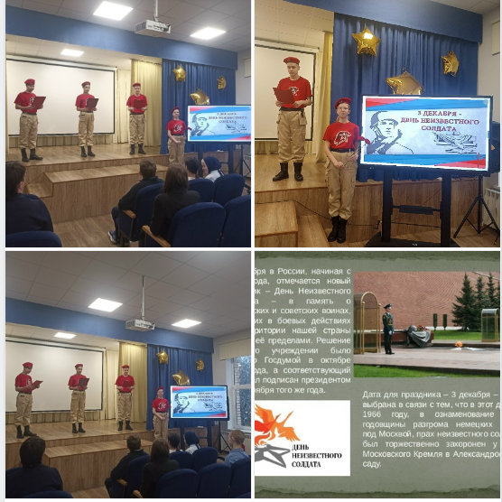 В начале мероприятия ребят познакомили с историей возникновения этой памятной даты, почему именно 3 декабря было выбрано для сохранения памяти воинской доблести. Рассказали о мемориале «Могила Неизвестного Солдата». Также дети узнали, что ежегодно работают поисковые отряды «Вахта памяти», которые находят останки советских солдат и опознают многих по медальонам.