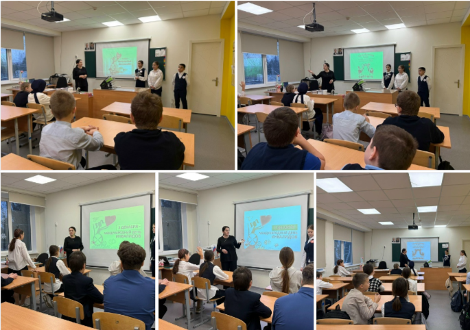 3 декабря в 5 ,6 ,8- ых классах советник директора по воспитанию и работе с детскими общественными объединениями Кадимова З. С. совместно с участниками "Движения первых" провела важную беседу, посвящённую Всемирному дню инвалидов.