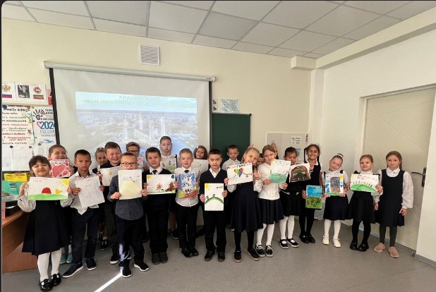 Во 2 классе прошел классный час «Любимый город», посвященный дню рождения города Нижнекамск. Ребята подготовили рисунки для школьной выставки