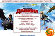 Завтра, 17 сентября, Детская Районная Дума совместнос культурным центром "Чулман-Су" организует благотворительный показ видеофильмов. В 13.00 будет показан - "Как приучить дракона - 2", в 19.00 - "Первый мститель - другая война". Собранные средства пойдут на лечение Сидоркина Вадима.