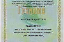 В марте месяце ученики нашей школы принимали участие в Республиканском конкурсе плакатов наглядной агитации против идей терроризма и экстремизма «Миру-мир!» в рамках Республиканского фестиваля «Вместе мы - одна страна!». Учащиеся рисовали плакаты и рисунки. Ученица 5а класса Ивлева Юлия в муниципальном этапе получила диплом III степени, дальше ее работа была представлена в Казани, где была отмечена грамотой Министерства Образования и Науки РТ. Поздравляем Юлю с победой и желаем ей творческих успехов!
