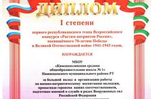 13 февраля 2013 года на базе Казанского суворовского училища состоялся Республиканский патриотический форум молодежи и ветеранов Республики Татарстан «Славим защитников Отечества».На этот форум были приглашены и руководители учреждений –победителей первого республиканского этапа Всероссийского конкурса «Растим патриотов России».Наша школа (КП №1) была награждена Книгой Памяти «Герои Российской Федерации» и дипломом 1-ой степени за большой вклад в организацию работы по военно –патриотическому воспитанию молодежи, пропаганде героизма наших соотечественников, подготовке юношей к службе в рядах Вооруженных сил Российской Федерации и участие в конкурсных мероприятиях.Также были награждены Почетной грамотой министра образования и науки РТ, Министерства по делам молодежи и спорту и туризму РТ, председателя РК ВВВС директор школы Сибгатуллина Ф.А., Благодарственными письмами – Ковальчук З.Н., Исхакова Ф.М., Некрасова Г.М., Багапова О.И.и сертификатом участников - Ибрагимова Р.С.,Зяляева г.М. Поздравляем всех с заслуженной победой и желаем дальнейших творческих и профессиональных успехов.
