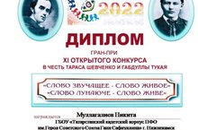 Очередной победный урожай принесли наши воспитанники с XI ОТКРЫТОГО КОНКУРСА в честь Тараса Шевченко и Габдуллы Тукая «Слово Звучащее -Слово Живое», который недавно проходил среди образовательных организаций нашего города. Вот они наши герои: Муллагалиев Никита, Павлов Бахтияр, Абшаров Савелий, Идрисов Кирилл, Колчин Артем, Конев Илья, Кириллов Павел,Захаров Алексей, Коробенков Александр, Перевозчиков Андрей!