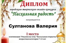 20.04.2020 Поздравляем Султанову Валерию с первым местом в творческом онлайн-конкурсе "ПАСХАЛЬНАЯ РАДОСТЬ"!