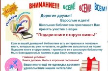 Если у вас дома есть прочитанные книги ,художественная литература, различные энциклопедии - вы можете подарить их школьной библиотеке! Книги должны быть в хорошем состоянии.
