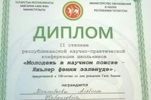 Наши ученицы Миннибаева Альбина (11а) и Махмутова Эндже (11а) удостоились диплома II степени и диплома лауреата в республиканской научно-практической конференции школьников "Молодежь в научном поиске - Яшьләр фәнни эзләнүдә", Поздравляем их и их научного руководителя, Фаттахову Ильсию Ильгамовну, и желаем дальнейших успехов!