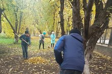 Учащиеся гимназии активно убирают опавшую осеннюю листву на закрепленных территориях