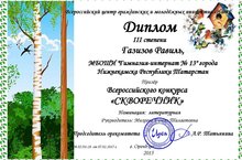 Подведены итоги Всероссийского творческого конкурса "Скворечник". Газизов Равиль из 4 А класса стал призером- Диплом III степени в номинации "Литературная". Поздравляем!!!