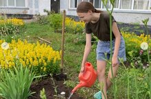 Полив цветов на участке лицея — важная часть ухода за растениями, которая помогает сохранить их здоровье и красоту. Ребята из трудовой бригады все делают правильно.