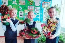 Обучающиеся 3а класса - Ошлаков Алексей, Фуражкина Ольга, Саттаров Тимур участвуют в школьной выставке "Дары осени".