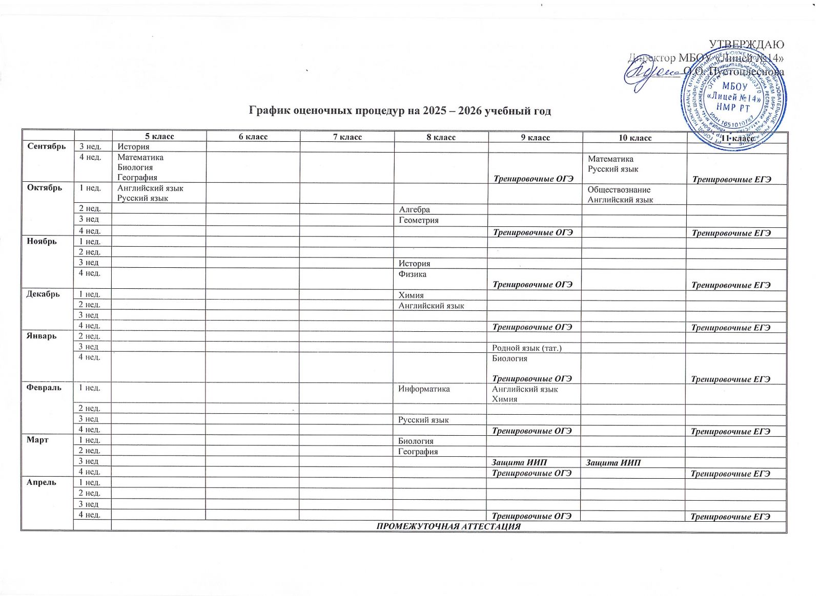 Приказ МБОУ "Лицей №14" НМР РТ "Об утверждении графика оценочных процедур на 2025 - 2026 учебный год"
