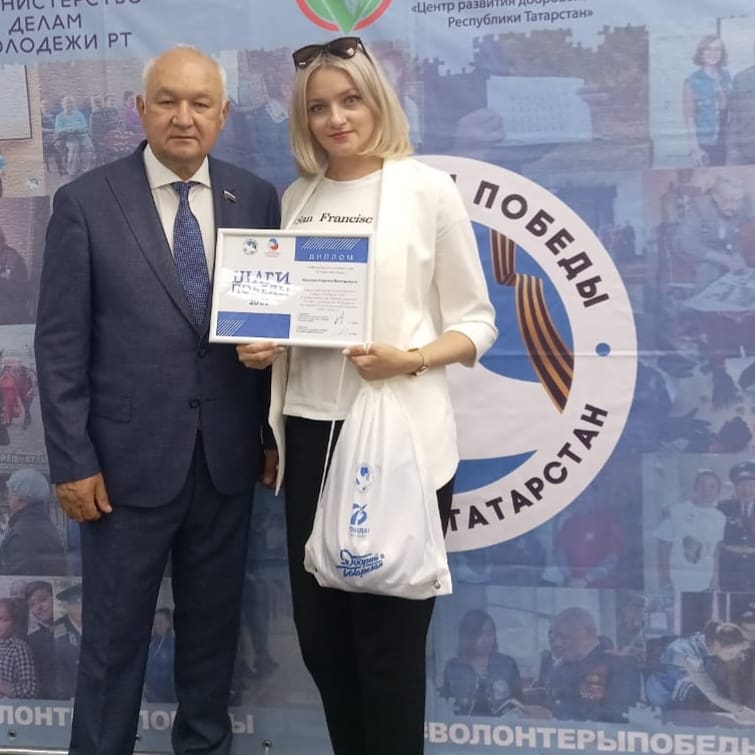 9 июля 2021 года на базе Мультимедийного исторического парка «Россия —Моя История» в г.Казань состоялось торжественное награждение победителей Республиканского проекта #ШагиПобеды2021. Поздравляем наших волонтёров "Искра Надежды" и их руководителя Катаеву К.В., которые были награждены дипломом победителя в номинации: "Открытие года". Молодцы! Гордимся! Напоминаем, что с 16 апреля по 1 июня наши волонтёры проходили 6 этапов республиканского проекта. Активисты познакомились с платформой «Skill Cup», участвовали в онлайн-акциях и были на прямых эфирах с лидерами молодёжной политики республики, узнали больше об истории своей семьи. Участниками проекта стали более 850 учащихся из 80 общеобразовательных учреждений. В Проекте приняли участие как образовательные учреждения Республики Татарстан, так и общественные объединения Татарстана.2021 елның 9 июлендә Казан шәһәренең «Россия —минем тарих "мультимедиа тарихи паркы базасында "Шагипобеде2021" республика проектында җиңүчеләрне бүләкләү тантанасы узды. Без "Өмет чаткысы" волонтерларын һәм аларның җитәкчесе Катаев К.В. котлыйбыз, алар "Ел ачышы" номинациясендә җиңүче дипломы белән бүләкләнделәр. Афәрин! Горурланабыз! Исегезгә төшерәбез, 16 апрельдән 1 июньгә кадәр безнең волонтерлар Республика проектының 6 этабы уздылар. Активистлар «Skill Cup» платформасы белән таныштылар, онлайн-акцияләрдә катнаштылар һәм республиканың яшьләр сәясәте лидерлары белән турыдан-туры эфирда булдылар, үз гаиләләренең тарихы турында күбрәк белделәр. Проектта 80 гомуми белем бирү учреждениесеннән 850 дән артык укучы катнашты. Проектта Татарстан Республикасының белем бирү учреждениеләре дә, Татарстанның иҗтимагый берләшмәләре дә катнашты.