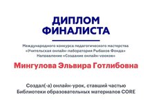 Учитель физики Мингулова Э.Г. приняла участие в Международном конкурсе педагогического мастерства "Учительская онлайн-лаборатория Рыбаков Фонда" и получила диплом финалиста в направлении: "Создание онлайн-уроков". Поздравляем и желаем новым достижений!