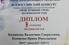 В МБОУ "Гимназия 179" Ново- Савиновского района города Казани 21 октября 2023 года прошел XVI Всероссийский конкурс педагогического мастерства "Мой лучший урок". На очный тур были приглашены 132 педагога изо всех районов Республики Татарстан. Работа была организована в четырёх направлениях: гуманитарное, естественно-научное, начальная школа, дошкольное и дополнительное образование. Наши педагоги Хомякова Ирина Николаевна, учитель химии высшей квалификационной категории, и Казанкова Валентина Гавриловна, учитель русского языка и литературы высшей квалификационной категории, представили свой интегрированный урок литературы и химии в формате "Литературной гостиной" по теме: "Д.И. Менделеев и А.А. Блок". Работа получила высокую оценку коллег и жюри конкурса. Хомякова И.Н. и Казанкова В.Г. стали обладателями Диплома II степени.