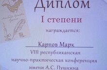 Поздравляем ученика 9г класса Карпова Марка и его руководителя Васильеву С.А. с победой в VIII Республиканской научно-практической конференции имени А.С.Пушкина, которая проходила 28 октября 2022 года в г. Лениногорске.Цель Конференции - поддержка творческой, познавательной и интеллектуальной инициативы обучающихся посредством привлечения к исследовательской и проектной деятельности в различных областях науки и культуры.Всего в конференции приняли участие 228 учеников школ Республики Татарстан.28 нче октябрьдә Лениногорск шәһәрендә үткәрелгән А.С. Пушкин исемендәге VIII Республика фәнни-гамәли конференциясендә җиңү яулаган 9г сыйныф укучысы Карпов Марк (җитәкчесе Васильева С.А.) чын күңелдән котлыйбыз. Конференциядә барлыгы 228 укучы катнашты. Маркка киләчәктә дә иҗади уңышлар телибез!Поздравляем ученика 9г класса Карпова Марка и его руководителя Васильеву С.А. с победой в VIII Республиканской научно-практической конференции имени А.С.Пушкина, которая проходила 28 октября 2022 года в г. Лениногорске.Цель Конференции - поддержка творческой, познавательной и интеллектуальной инициативы обучающихся посредством привлечения к исследовательской и проектной деятельности в различных областях науки и культуры.Всего в конференции приняли участие 228 учеников школ Республики Татарстан.28 нче октябрьдә Лениногорск шәһәрендә үткәрелгән А.С. Пушкин исемендәге VIII Республика фәнни-гамәли конференциясендә җиңү яулаган 9г сыйныф укучысы Карпов Марк (җитәкчесе Васильева С.А.) чын күңелдән котлыйбыз. Конференциядә барлыгы 228 укучы катнашты. Маркка киләчәктә дә иҗади уңышлар телибез! -