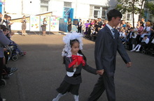 На торжественной линейке выступила директор школы Н.Ф. Буханова. Она поздравила всех учеников с началом учебного года. А главной гостьей праздника была Пеппи Длинный чулок, которая с детьми провела различные веселые игры.