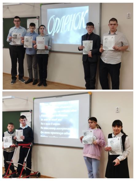 6, 7 hәм 9нчы сыйныфларда "Алар Ватан өчен көрәштеләр" исемле яшь сакчылар, герой-пионерлар турында әңгәмә үткәрелде. Соңыннан "Орленок" фильмын карау hәм фикер алышу булды.