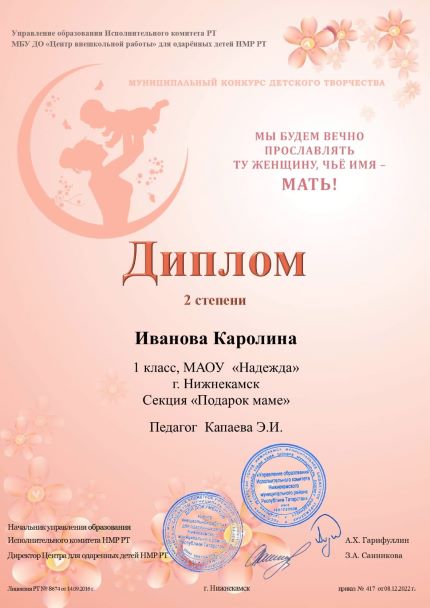 Ученица 1 класса Иванова Каролина (педагог: Капаева Э.И.) приняла участие в муниципальном конкурсе детского творчества "Мы будем вечно прославлять ту женщину, чьё имя - Мать!" и заняла 2 место! Поздравляем!