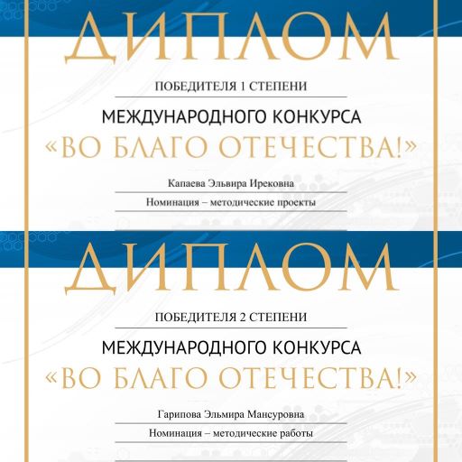 Учителя начальных классов Капаева Эльвира Ирековна и Гарипова Эльмира Мансуровна приняли участие в Международном конкурсе "Во благо Отечества" в номинации "Методические проекты". Поздравляем!