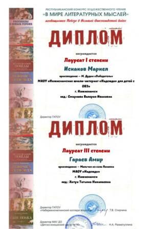 Учащиеся 1 А класса Гараев Амир (классный руководитель Хитун Т. Н.) и 2А класса Искаков Маркел (классный руководитель Смирнова В. И.) приняли участие в Республиканском конкурсе художественного чтения "В мире литературных мыслей", посвящённый 77-летию Победы в Великой Отечественной войне, г. Набережные Челны.