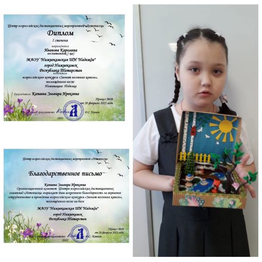 Учащиеся 1 подготовительного класса под руководством учителя начальных классов Капаевой Э.И. приняли участие во Всероссийском конкурсе "Звенит весенняя капель", посвященного весне. В номинации "Поделка" Иванова Каролина заняла 1 место. Поздравляем!