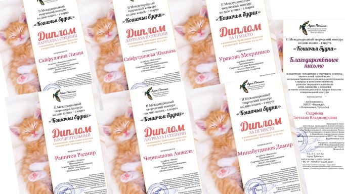 Во II Международном творческом конкурсе «Кошачьи будни» ко дню кошек приняли участие более 900 образовательных учреждений из 70 регионов России, 42 учебных учреждения из США, Канады, Чешской Республики, Молдовы, Республики Казахстан, Узбекистана, ЛНР, ДНР и Республики Беларусь. Получено более трех тысяч произведений в шестнадцати номинациях.
