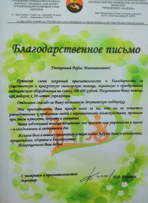 Добрые дела стекаются в общий поток, приносят счастье и надежду, наполняют радостью сердца тех, кто участвует в этом благородном деле. Хотелось бы поблагодарить ИП Мустафина Р.М. за выделение финансовой помощи в размере 500000 рублей, инициативную группу «Во благо миру» -за помощь в сумме 218450 рублей на приобретение медицинского оборудования.
