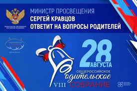 28 августа 2021 года состоится VIII Общероссийское родительское собрание: Министр просвещения Российской Федерации Сергей Кравцов в прямом эфире ответит на вопросы родителей школьников. Общение пройдёт в формате диалога с включениями из разных регионов страны. Следить за происходящим можно будет в рамках онлайн-трансляции.