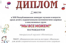 Ежегодно обучающиеся нашего учреждения принимают участие в республиканском конкурсе музыки и скусств среди детей с ОВЗ и инклюзивных групп "Мы все можем! В этом году школьники заняли призовые места в нескольких номинациях конкурса.