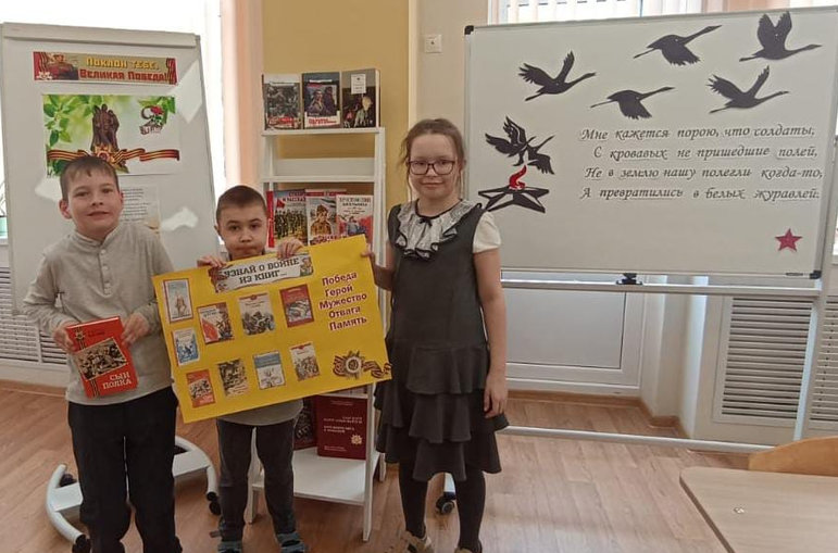 В библиотеке была оформлена книжная выставка "Поклон тебе, Великая Победа!", на которой ребята смогли познакомиться с детскими книгами о войне, а также с книгами о наших земляках, участниках войны, о героях Советского Союза. А в завершении встречи выполнили коллективную работу "Узнай о войне из книг", ещё раз вспомнив героев книг.