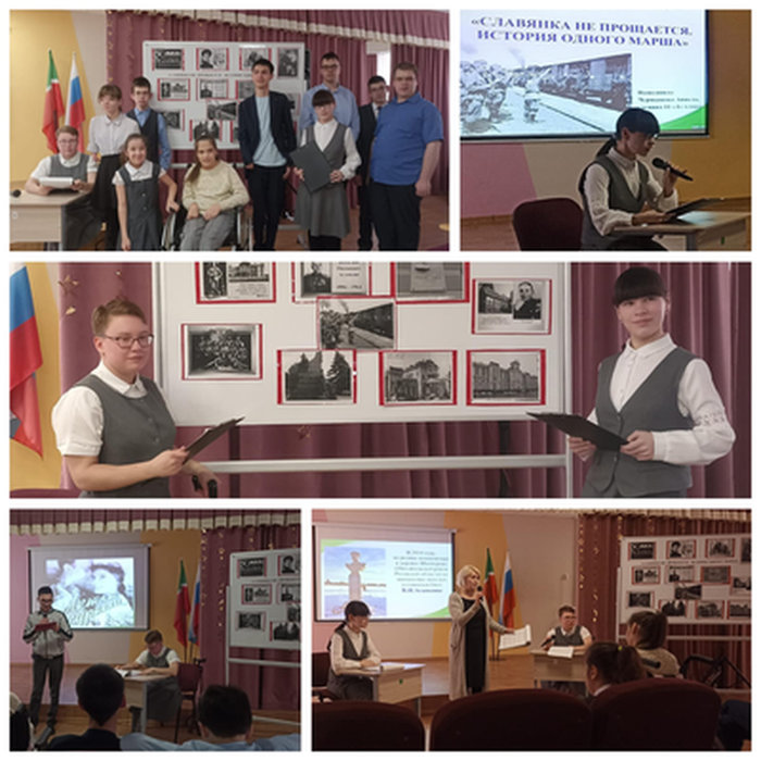 Опубликовано: 17.05.2024В рамках Защиты проекта, ученица 11 класса Чернышова Анжела подготовила и провела для учащихся 5 - 11 классов классный час в форме музыкально-литературной гостиной "Славянка не прощается. История одного марша" с целью воспитания у учащихся патриотиотизма не словами, а через эмоциональное восприятие легендарного марша В Агапкина "Прощание славянки".