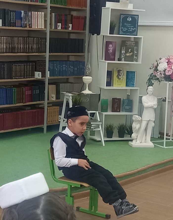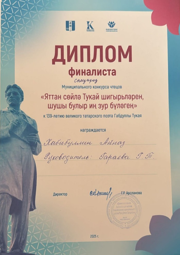 Опубликовано: 10.04.2025С радостью поздравляем ученика, 1 а класса Хабибуллина Айназа, с победой на муниципальном конкурсе чтецов " Яттан сойлэ Тукай шигырьлэрен, шушы булыр ин зур булэген" к 139 - летию великого татарского поэта Габдуллы Тукая. Желаем не останавливаться на достигнутом, всегда двигаться вперед, покорять любые вершины.