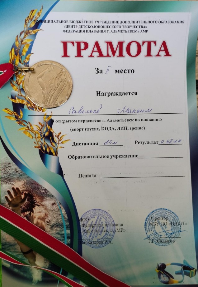 Поздравляем, Савельева Максима, победителя соревнований по плаванию для детей с ОВЗ