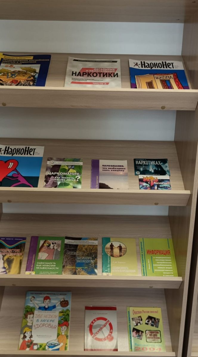 Опубликовано: 27.05.2025В школьной библиотеке оформлена книжно-иллюстративная выставка "Мы выбираем жизнь" с информацией о медицинских, социальных и правовых последствиях употребления наркотиков.