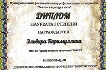 Заместитель директора по учебно-воспитательной работе Центра детского творчества Каримуллина Эльвира Юлдашевна впервые приняла участие в муниципальном фестивале-конкурсе фольклорного творчества "Веков связующая нить" в номинации декоративно-прикладное творчество "Золотые руки" и стала Лауреатом 1 степени!