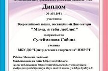 Воспитанница объединения "Акварель" - Сулейманова Сабина стала участницей Всероссийской акции, посвящённой Дню матери «Мама, я тебя люблю!».