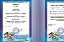Оргкомитет Всероссийского Центра гражданских и молодёжных инициатив "Идея" отметил педагога - Фархуллину Гульназ Вакыйфовну Благодарственным письмом и выразил благодарность за организацию участия и подготовку воспитанницы во Всероссийском экологическом конкурсе «Здравствуй, маленькая птица, вестница осенних дней!».