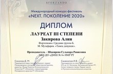 25 апреля в г.Казань прошёл Международный конкурс «Next. поколение 2020» ученица фортепианного отдела Закирова Алия стала лауреатом 3 степени, преподаватель Шакирова Г.Р. -