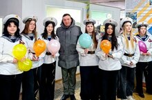Утро началось с тёплого и оригинального поздравления: девушки из группы СЭ‑25, одетые в форму военно‑морского флота, вместе с куратором З. М. Сверлышковой встречали мужской коллектив колледжа. В руках у студенток были праздничные шары — они создавали по-настоящему торжественную атмосферу и дарили коллегам улыбки и хорошее настроение с самого начала рабочего дня.
