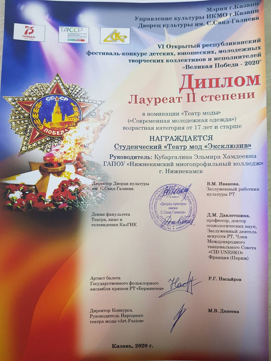 Опубликовано: 06.12.2020В Нижнекамском многопрофильном колледже обучается очень много талантливых студентов! И среди них есть студенческий театр мод «Эксклюзив», который 6 декабря принял участие в VI Открытом Республиканском фестивале-конкурсе детских, юношеских, молодежных творческих коллективов и исполнителей «Великая Победа». Фестиваль-конкурс прошел в г. Казань во дворце культуры им.С. Саид-Галеева.