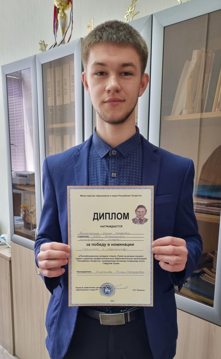 В конкурсе участвовали 72 обучающихся из 37 профессиональных образовательных организаций РТ, среди которых студент нашего Колледжа Нигматуллин Динар Ильсурович награждаеться за победу в номинации "Стремление к совершенству". Руководитель Исмагилова Риана Ильгизаровна.