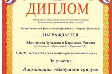 16 декабря 2015 года на базе ГАПОУ "Техникум нефтехимии и нефтепереработки" прошёл Межрегиональный конкурс "Лучший по профессии". Заместитель начальника цеха №1501 ПАО "Нижнекамскнефтехим" Бреднев Владимир Геннадьевич торжественно вручил благодарственное письмо за активное участие, от имени администрации ГАПОУ "ТНН" директору ГАПОУ "НИТ"Шаихову Р.Р., благодарственное письмо за подготовку участников конкурса Хамидуллиной К.Ф., а студентам нашего техникума Алтынбаева В.Э. и Малышев А.А. сертификаты участников.
