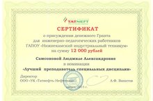 1 сентября 2015 года господин Туйкин Н.М. от имени УК "Татнефть" торжественно вручил сертификаты и денежные гранты лучшим преподавателям "Нижнекамского индустриального техникума"