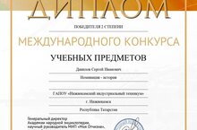 Поздравляем Данилова Сергея Ивановича преподавателя истории Нижнекамского индустриального техникума с Победой на Международном конкурсе в номинации - история! Конкурс организован Академией народной энциклопедии в рамках Международного инновационного проекта "Моя Отчизна".