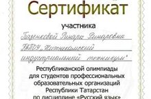 25 марта 2021 г. студентка группы 433 Тазенкова Ринара приняла участие в Республиканской олимпиаде для студентов профессиональных образовательных организаций РТ по дисциплине «Русский язык», проходившей в Чистопольском многопрофильном колледже (Преподаватель: Никошина Н.И.)